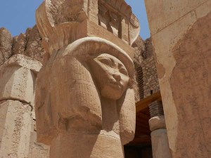 Most of the official statues commissioned of Hatshepsut show her less symbolically and more naturally, as a woman in typical dresses of the nobility of her day. Notably, even after assuming the formal regalia, Hatshepsut still described herself as a beautiful woman, often as the most beautiful of women, and although she assumed almost all of her father’s titles, she declined to take the title “The Strong Bull” (the full title being, The Strong Bull of his Mother), which tied the pharaoh to the goddesses Isis, the throne, and Hathor, (the cow who gave birth to and protected the pharaohs) – by being her son sitting on her throne – an unnecessary title for her, since Hatshepsut became allied with the goddesses, herself, which no male pharaoh could. Rather than the strong bull, Hatshepsut, having served as a very successful warrior during the early portion of her reign as pharaoh, associated herself with the lioness image of Sekhmet, the major war deity in the Egyptian pantheon.